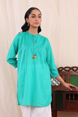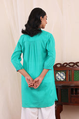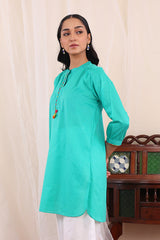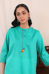 Speckled kurta with a hidden placket, cinched sleeves and tassels on placket.