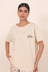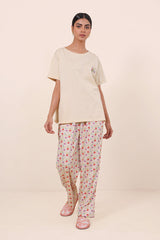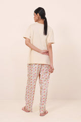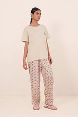 Digitally printed, breathable cotton knit tee, paired with printed viscose pyjamas. The print illustartions are designed by Tuba ka Damaagh. Size 10 is Small, size 12 is Medium and size 14 is Large.
