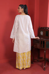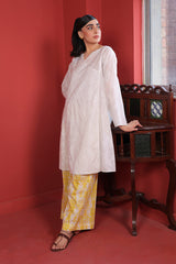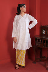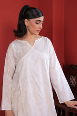 A white on white embroidered angrakha style shirt with panels at the back.