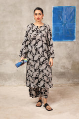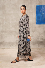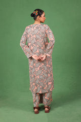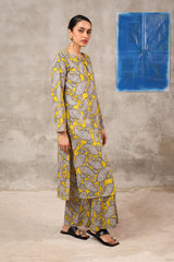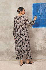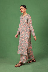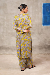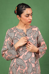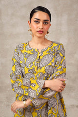 This paisley-printed kurta features a round neckline with a V-slit, enhanced with buttons and tassel detailing. Paired with matching printed straight trousers, the paisley pattern, inspired by ancient Persian designs, adds an authentic touch to this contemporary ensemble.