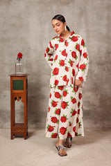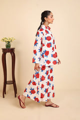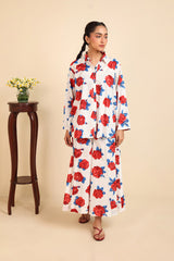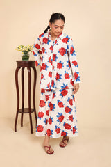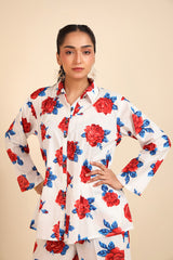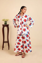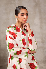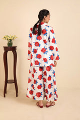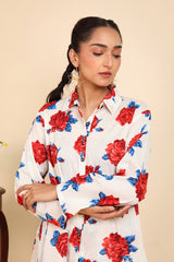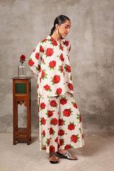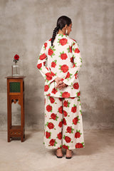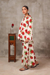This boldly hued rose-printed co-ordset featuring a button-down shirt with a sleek band collar neckline, it offers a perfect balance of structure and style. Paired with wide-leg printed trousers, this ensemble seamlessly blends comfort with sophistication.