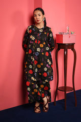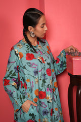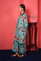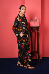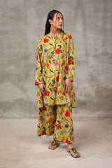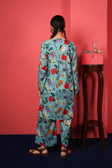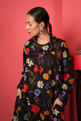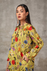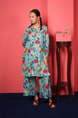 Revel in style with this seamless floral-printed kurta, featuring a round band neckline and buttons on the front placket. Side-friendly pockets add practicality, while the matching printed straight-fit trousers offer an easy, comfortable fit.