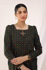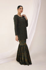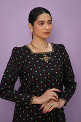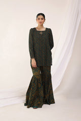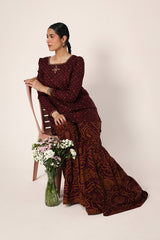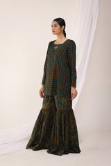 A classic-fit Bandhani printed kurta featuring a square neckline, delicately adorned with golden embroidery. The sleeve hems showcase subtle embroidered detailing, complementing the look. Paired with a contrasting Bandhani printed gharara for a timeless ensemble.