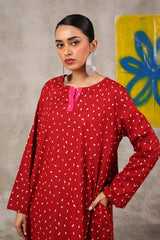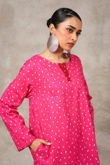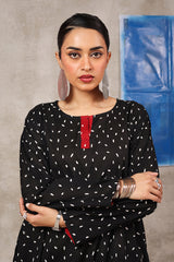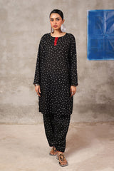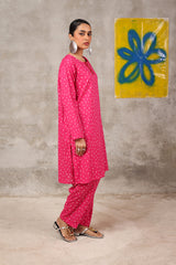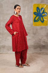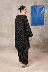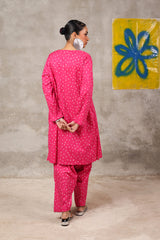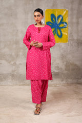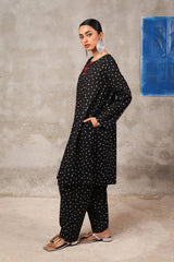 A scattered petals printed kurta, featuring a round neckline with a V-slit and a color-blocked placket for a modern touch. The drop-shoulder design offers a relaxed, effortless vibe, while side pockets provide practical convenience. Paired with matching printed shalwar, enhanced with stitching details at the ankle hems.