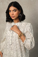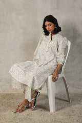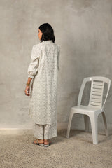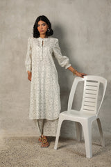 A straight-fit printed kurta featuring a round neckline and a placket adorned with delicate stitch detailing. Subtle gathers enhance the sleeve hems, adding a soft touch. Paired with matching printed straight trousers for a coordinated look.