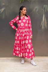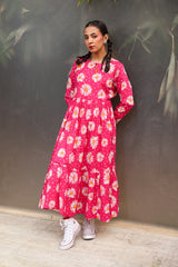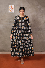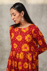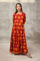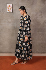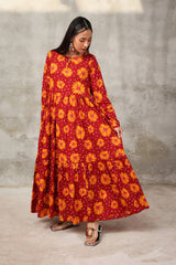 Vibrant-hued sunflower-printed tiered long frock featuring a round neckline with a keyhole opening, delicately embellished with tassels. Gathers around the empire waist create a flattering, flowing silhouette, adding a graceful touch to the design.