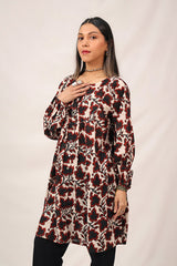 A Jahota floral-printed loose-fit flared top with a round neckline, adorned with buttons on the front slit. The bodice is enhanced with round stitching details, and the sleeves are cinched for a stylish finish. Can be paired with any generation bottom for a versatile look.
