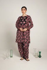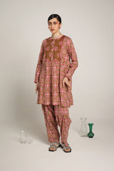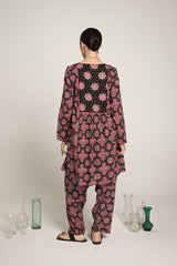 A printed A-line kurta, featuring a round neckline adored with piping trim. The front placket is adorned with buttons, while piping details on the bodice and sleeve hems create a refined contrast. Gentle gathers at the empire waist lend a graceful flare, enhancing the silhouette with effortless movement. Paired with a matching printed classic-fit shalwar for a cohesive, artful look.