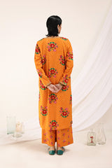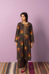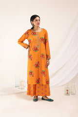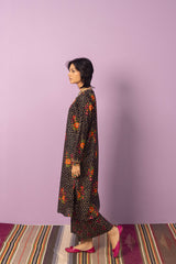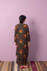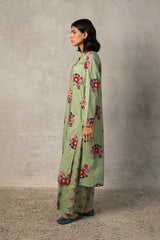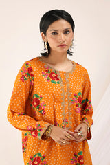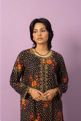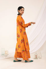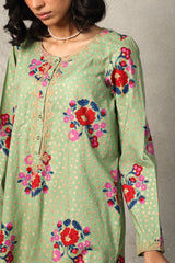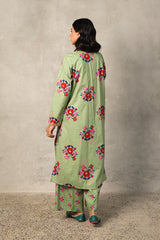 A vibrant straight-fit printed kurta featuring a round neckline, adorned with delicate embroidered details along the placket and accented with buttons. The sleeve hems echo the same intricate embroidery, adding a refined touch. Paired with coordinated printed wide-leg trousers for an effortless look.