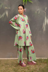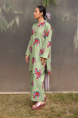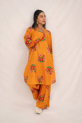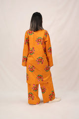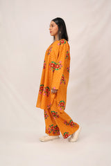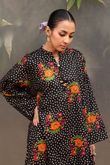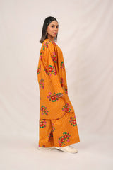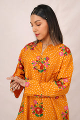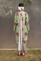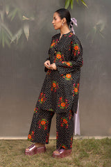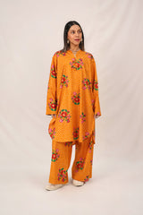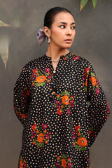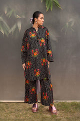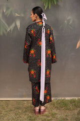 A relaxed fit printed kurta with V neckline, featuring exquisite all over gold dotted details and tassel detailing at the front. Paired with matching printed wide legged culottes..