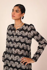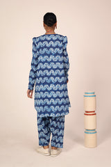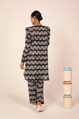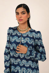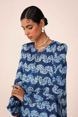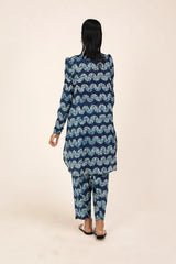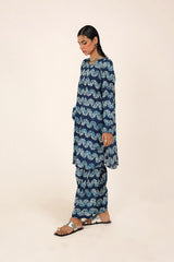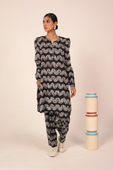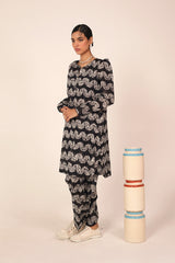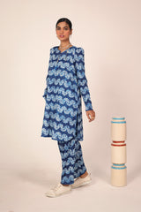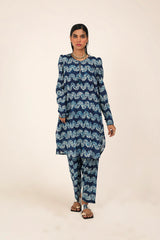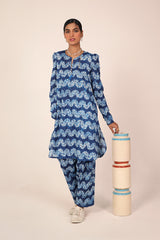 A classic fit tie and dye printed kurta featuring a round neckline with a V-slit, adorned with tassel detailing. The kurta is styled with classic fit sleeves and paired with matching printed classic fit shalwar.