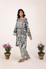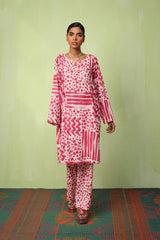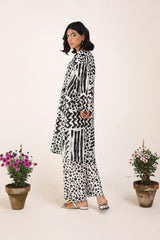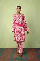 An abstract brushstroke-printed kurta featuring a round neckline with a V-slit. The bodice is adorned with thread-braided tassels, enhanced with button details, adding a touch of texture and grace. Paired with contrasting printed straight-fit trousers.