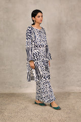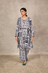 An abstract brushstroke-printed kurta featuring a round neckline with a V-slit. The bodice is adorned with thread-braided tassels, enhanced with button details, adding a touch of texture and grace. Paired with contrasting printed straight-fit trousers.