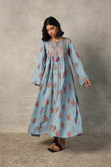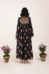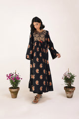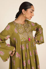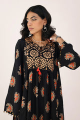 A Gota Glow-printed frock featuring a round neckline with a keyhole style, adorned with delicate tassels. The shimmering paisley motifs exude a hint of vintage charm, while soft gathers around the empire waist create a graceful silhouette. Finished with gota detailing on the sleeve hems, this piece can be effortlessly paired with any generation fits.