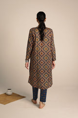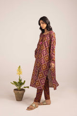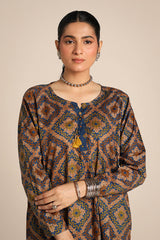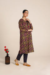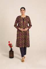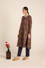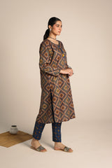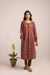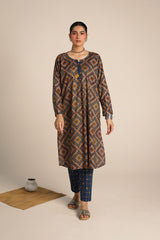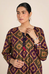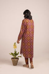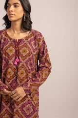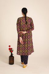 A breezy, loose-fit printed kurta featuring a round neckline with a V-slit, adorned with delicate tassel details. Soft gathers add movement and ease to the silhouette. Paired with coordinated printed cigarette pants, this set brings together grace and comfort for a refined look.