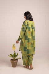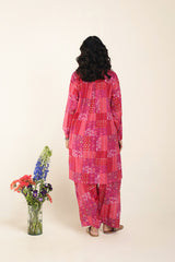 An easy-fit patchwork-style printed kurta featuring a round neckline with delicate buttons on the front placket. The intricate print blends heritage motifs with modern artistry. Cuffed sleeves adorned with button details add a refined touch, while functional side pockets bring convenience. Paired with a matching farshi shalwar for a timeless silhouette.