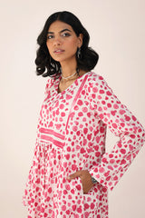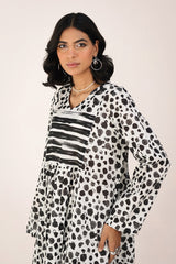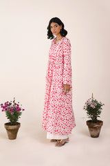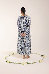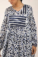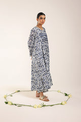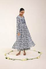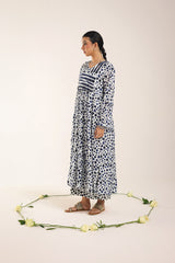 A long, flared brushstroke-printed kurta featuring a V-neckline. The gathers around the empire waist create a natural, flowing flare that enhances the silhouette. Versatile and effortlessly chic, it can be paired with any GEN fits for a complete look.