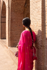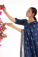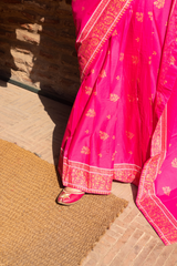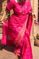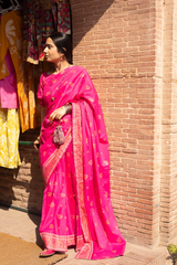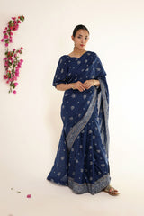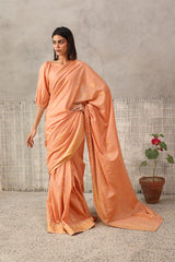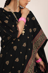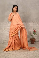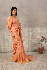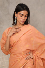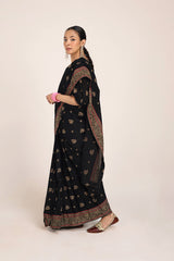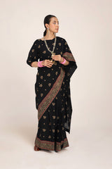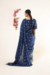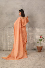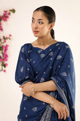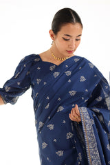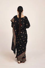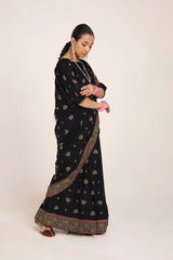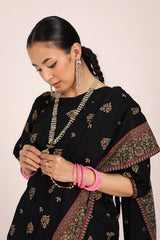 A jacquard-inspired printed saree, draped in classic charm with intricate gold patterns flowing seamlessly. Paired with a structured blouse featuring a square neckline and cinched sleeve hems, adorned with delicate borders, this ensemble blends heritage with effortless sophistication.