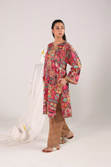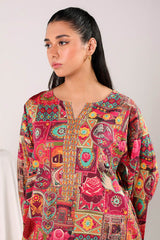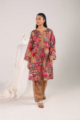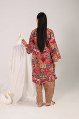 A vibrant truck art-printed kurta featuring a round neckline with a V-slit, accented with Mukaish detailing. The lively print brings a playful twist to the look, further enhanced by appliqued motifs. It is finished with functional side pockets for ease and paired with a contrasting printed classic-fit shalwar for a bold, coordinated ensemble.