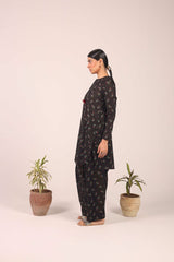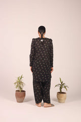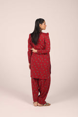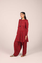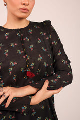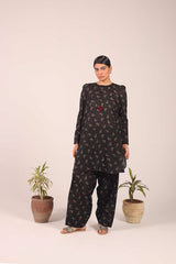 A classic-fit printed kurta with a band round neckline and V-slit, embellished with playful tassel detailing. The kurta is adorned with a vibrant floral pattern and features stylish puff sleeves. It’s paired with a matching printed khula poucha shalwar, creating a chic and complete look.
