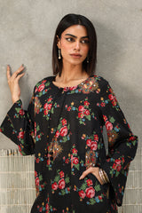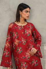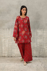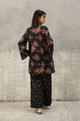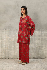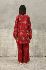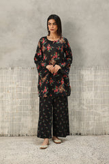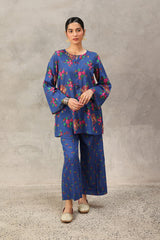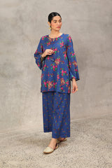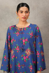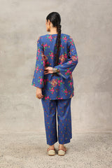 A classic-fit floral-printed kurta with a round neckline and V-slit, adorned with tassel detailing. The print blends traditional Balochi stitching with cheet floral motifs, creating a unique and vibrant design. Paired with matching printed culottes for a coordinated look.