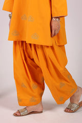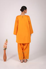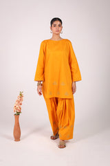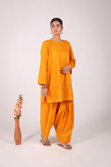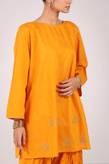 An embroidered solid classic-fit kurta featuring a round neckline and golden lace-trimmed sleeve hems. The daman is adorned with delicate embroidered motifs , adding a festive touch. Paired with a matching embroidered farshi shalwar finished with golden lace on the ankle hemline, this ensemble exudes understated elegance.
