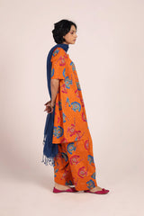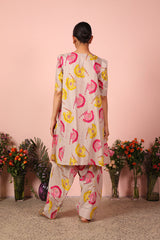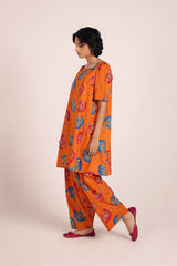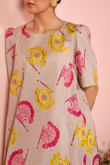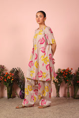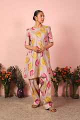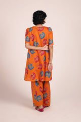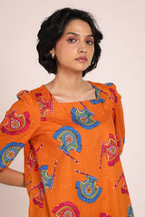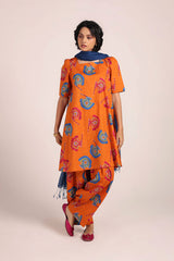 A relaxed-fit A-line shirt featuring a square neckline and soft puff sleeves, offering a effortless yet distinctive charm. The Pakistani hand fan-inspired print adds a cultural twist. Paired with matching printed khula poncha shalwar, detailed with stitching at the ankle hemline for a refined finish.