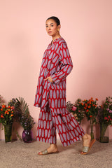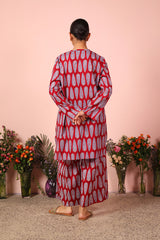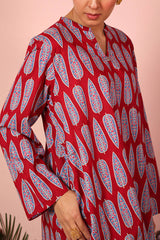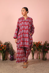 A classic, vibrant loose-fit printed kurta featuring a round band neckline with a V-slit and button detailing. Designed with functional side pockets for added ease. Paired with matching printed flared trousers for a bold yet effortless everyday look.