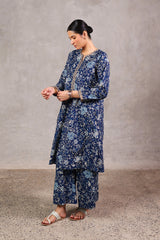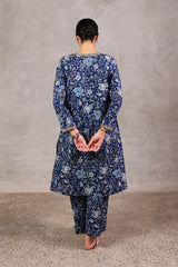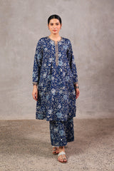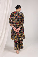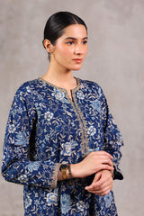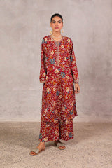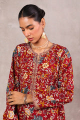 A vibrant floral-printed shirt featuring a round neckline with a V-slit, adorned with delicate embroidery on the neckline and front placket. The sleeve hems are finished with matching detailing. Paired with printed culottes for a cohesive, coordinated look.