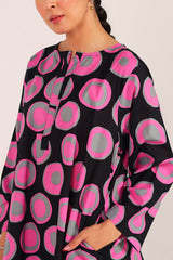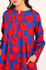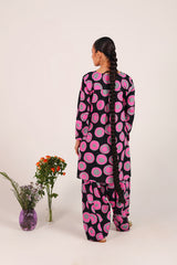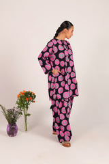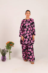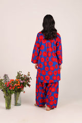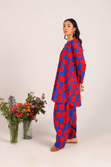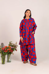 A relaxed-fit kurta showcasing a lively, eye-catching print, featuring round neckline and a V-slit. Thoughtfully designed with side pockets for practical comfort. ItÕs paired with a coordinated printed farshi shalwar, highlighted by fine stitching at the ankle hemline.