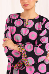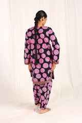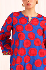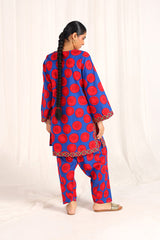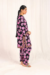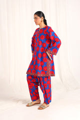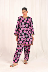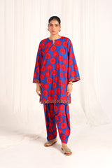 An easy-fit Dotted printed kurta featuring a round neckline with a V-slit. The vibrant printed slit and borders add a lively touch to the overall look. Paired with a matching printed classic-fit shalwar, detailed with subtle stitching along the ankle hemline.