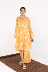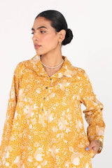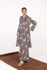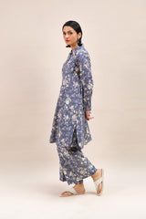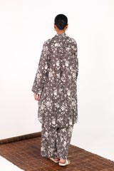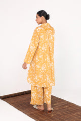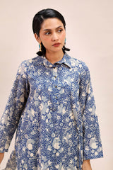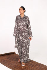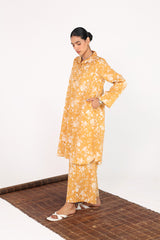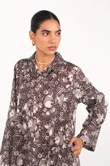 A loose fit printed shirt with a collared neckline and rounded shirt corners, featuring buttons along the front placket and a side pocket detail. Paired with matching printed culotte trousers.