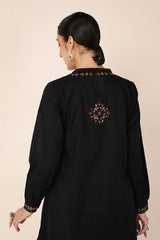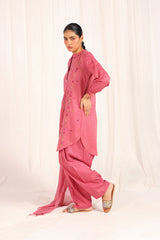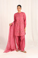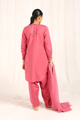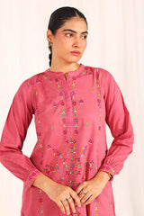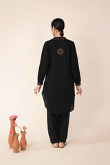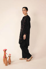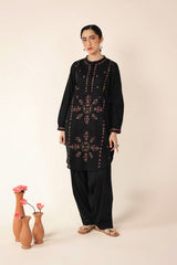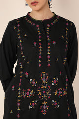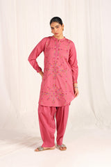 An embroidered straight-fit kurta with a round neckline, enhanced with colorful stitch detailing. Delicate floral embroidery adorns the kurta, while cinched sleeve hems feature intricate embroidery and stitch accents. Paired with a classic-fit shalwar, detailed with fine stitchwork along the ankle hemline for a refined finish.