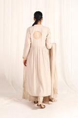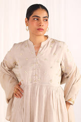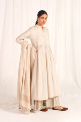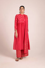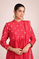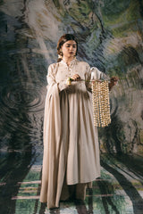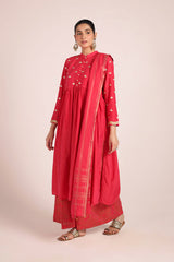 A classic flared shirt featuring golden stitching detail on the neckline and loop buttons along the front placket. The bodice and sleeves are adorned with delicate gota motifs, while the sleeve borders are finished with gota lace trim. Paired with jacquard culottes and a dupatta finished with denier borders for a glamorous look.