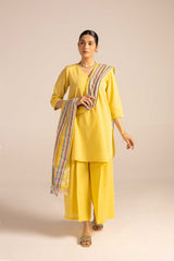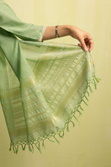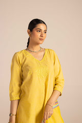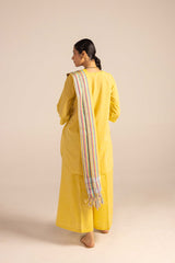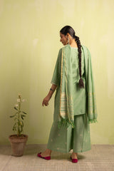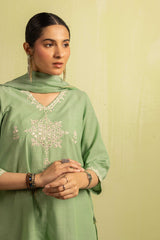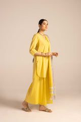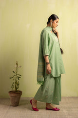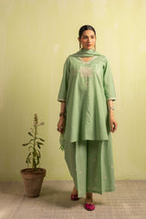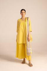 A classic-fit self-embroidered kurta featuring a V-neckline. The neckline and bodice are adorned with delicate self embroidery, further enhanced with subtle Aina work. The sleeve hems mirror the same intricate detailing. Paired with solid-hued flared trousers accentuated with Aina accents, and a matching solid dupatta finished with denier borders and soft frill detailing.