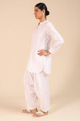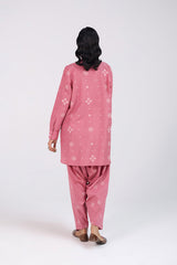 An embroidered shirt featuring a round neckline with a V-slit, adorned with delicate embroidery throughout. Designed with cuffed sleeves and side pockets for added ease. Paired with a matching classic-fit shalwar to complete the look.