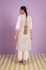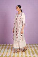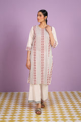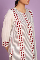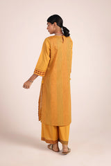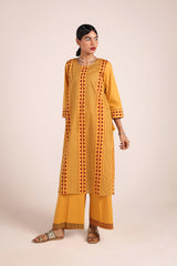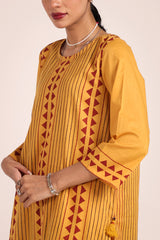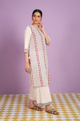 A straight-fit hand block-printed kurta with a round neckline, adorned with vibrant block print patterns. Paired perfectly with matching block-printed culottes for a cohesive, stylish look.