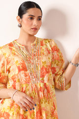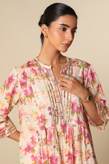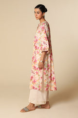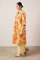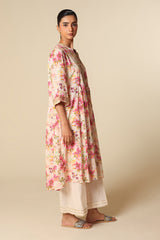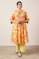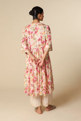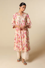 A paneled flared shirt with a low band V-neckline, highlighted with gota lace accents. Soft gathers at the bodice create graceful volume, while lace trims on sleeves add charm. Paired with culottes finished with complementing gota lace detail.