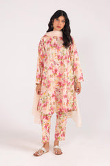 A floral paneled printed shirt featuring a round neckline with a V-slit, adorned with delicate mukaish work. Scattered gota-embellished motifs add a festive touch, while gota lace on the sleeve hems lends elegance. Paired with a checked lawn dupatta and matching printed straight-fit trousers.