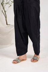 A classic-fit shalwar featuring black-on-black embroidery and hemline detailing, perfect for adding elegance to everyday wear.
