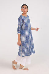 A classic-fit block printed shirt with a round neckline, finished with delicate lace detailing on the sleeve hems.