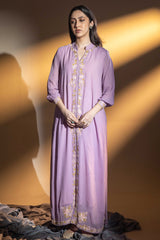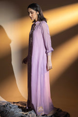 A formal classic-fit long shirt detailed with delicate embroidery, featuring a low band and V-neckline adorned with subtle beadwork along the front slit. The open-front silhouette adds a hint of modern ease, complemented by cuffed sleeves and relaxed culottes for festival look.