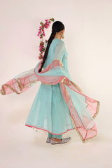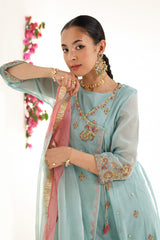 An embroidered formal angrakha featuring delicate naqshi work, enhanced with sequins and bead detailing on the neckline and sleeves, finished with tassels. Scattered embroidered motifs throughout. Paired with straight-fit trousers and a comfortable inner lining, this ensemble is completed with an embellished dupatta trimmed with kiran lace, ideal for festive occasions.