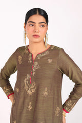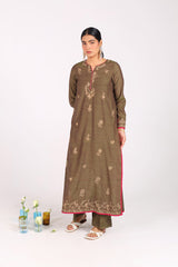 An embroidered long, classic-fit kurta featuring a round neckline with a V-slit, adorned with delicate zardozi embroidery and scattered motifs for a timeless look. The sleeves and shirt borders are finished with delicate jaal work, while contrast piping highlights the neckline, sleeves, hem, and chaaks. Comes with a soft inner for added comfort. Paired with solid culottes for effortless elegance.
