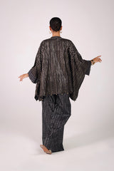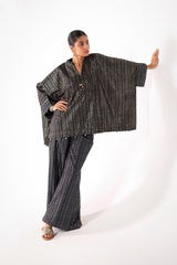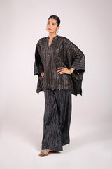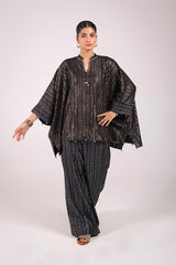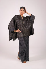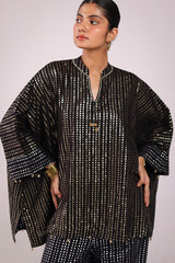 A kaftan-style foil printed kurta featuring a band neckline with a V-slit, adorned with beadwork and tassel embellishments. The sleeves and shirt hems are detailed with beadwork. Paired with matching foil-printed culottes, this set offers a perfect blend of disco flair and classy elegance.