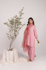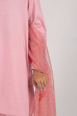 A loose-fit shirt featuring a V neckline, adorned with all-over stud embellishments on the front and sleeves. The ensemble is styled with cuffed peasant sleeves, finished with button detailing at the cuffs. Paired with a farshi shalwar and a printed organza dupatta enhanced with scattered studs for a modern, festive touch.