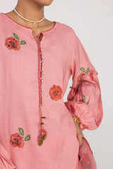 A loose fit shirt with round neckline with V slit, featuring full sleeves with puffed detailing and ruching on the elbow onwards. The ensemble features an overall floral inspired print with katdana beadwork and sequin embellishments on the neckline placket along with rose tassel inspired dory detailing at the neckline. Paired with matching printed culotte trousers and a matching printed organza dupatta with all over studs detailing.