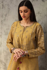 Classic-fit paneled shirt with a round neckline and tassel detailing along the V-slit. Delicate sequin and threadwork enhances the neckline, front and sleeves, which are finished with a button closure. Paired with a matching farshi shalwar with subtle stitch detailing along the hems. Comes with a coordinating medium silk dupatta with festive gota embellishments, finished with contrast piping and tassel accents along the edge.