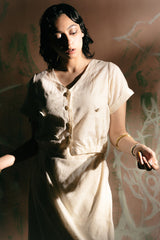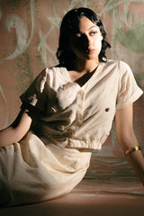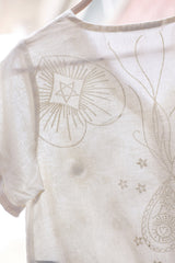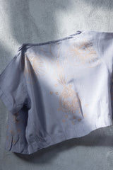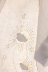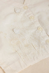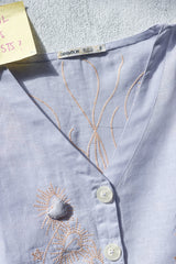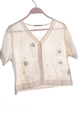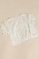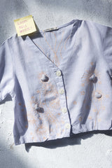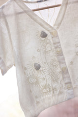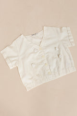 An embroidered short top with a V-neckline and button-down placket, accented with a handcrafted heart hanging that adds a touch of charm to its textured finish.