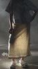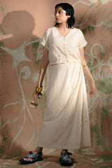A white-on-white embroidered skirt, fully lined and finished with buttons and a side slit for ease. It evokes an artist’s canvas come alive, where fluid artistry meets structured form.